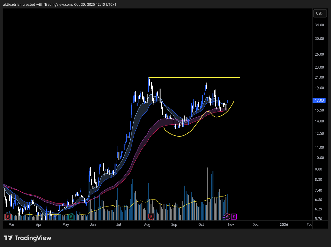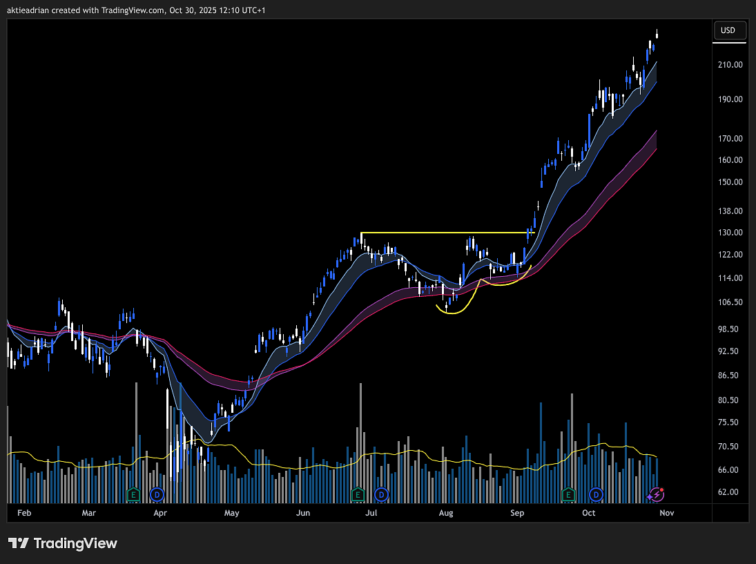 $JOBY formar just nu ett mönster som påminner mycket om $MU innan det senaste utbrottet. Det här är ett exempel på Volatility Contraction Pattern, ett av mina absoluta favoritmönster. Efter en kraftig uppgång har $JOBY gått in i en konsolideringsfas där varje rekyl är mindre än den förra. Priset har nyligen studsat ner till det nedre molnet (EMA50 & 65), vilket ofta fungerar som ett dynamiskt stödområde i starka trender. Samtidigt håller aktien en tight struktur och visar tecken på minskande volatilitet, vilket är precis det man vill se i en VCP. Jämför man med $MU ser man nästan samma sekvens, en serie av högre bottnar, avtagande svängningar och ett återtag av momentum när priset bryter över de kortare medelvärdena (EMA10 & 20) samt de lokala topparna (gul linje). När den typen av kontraktion sker i en aktie, leder det ofta till en kraftig expansion så fort köparna återtar kontrollen. Det varierar ibland hur många rekyler man får i en VCP, i $MU var det endast två, men ibland blir det fler.